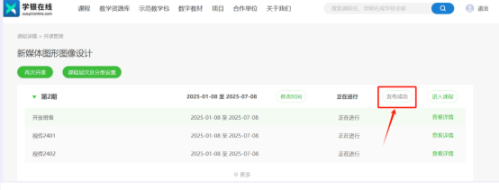 第四步:确认无误后,进入课程门户-期次管理-点击“发布课程”进行课程发布。(课程发布后将进行1个工作日的审核,审核过程中不影响老师用课,可正常用于教学。)