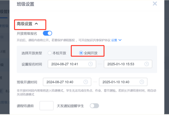 第二步:在课程下创建“开放班级”,并设置班级开放时间与全网开放状态。相关设置截图如下: