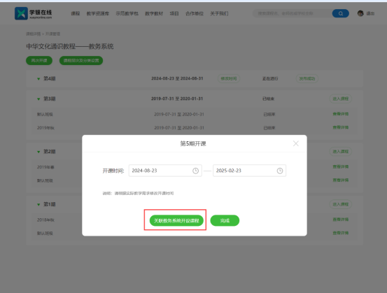 使用关联教务系统添加的期次,支持撤销关联按钮,确认后从期次组中将此课程id移除。课程进入申请发布流程后,将无法撤销关联。