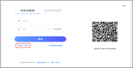 2、首次登录,通过【新用户注册】手机号注册登录,根据提示设置密码,并绑定单位UC码(UC码:1635)及学工号。