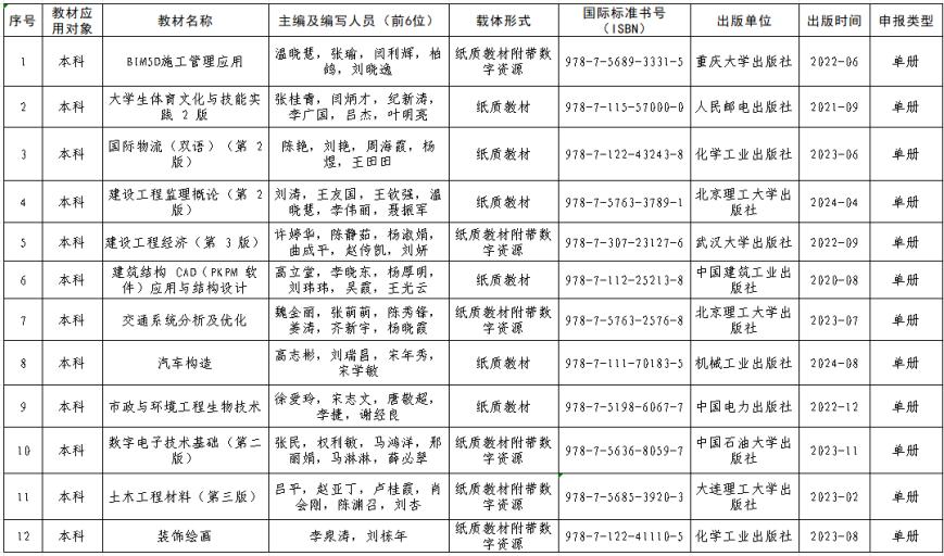 作为提升高校教学质量的核心资源,一流教材不仅是课程内容的重要载体,更是衡量一所学校办学水平、学科建设质量与人才培养能力的关键标志。长期以来,我校始终将教材建设置于教学改革与内涵发展的重要位置,从选题规划、团队组建到内容打磨、实践检验,形成一套完善的教材建设体系,此次 12 部教材集中入选,正是对学校这一工作的高度认可。