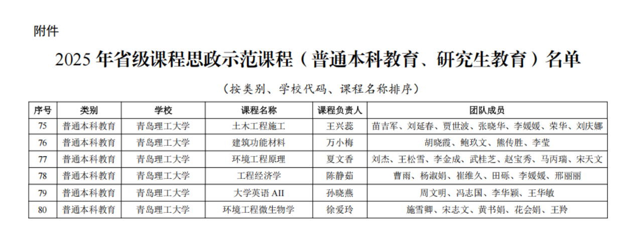 近日,山东省高等学校课程思政研究中心发布了《关于公布2025年省级课程思政示范课程(普通本科教育、研究生教育)名单的通知》。根据《关于开展2025年省级课程思政示范课程(普通本科教育、研究生教育)建设工作的通知》精神,青岛理工大学共获批6门本科教育课程思政示范课程,获批率100%,充分展现了学校在课程思政建设方面的扎实工作和显著成效。
