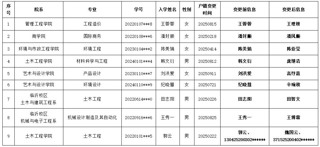 现有王蓉蓉等9名学生向学校递交了变更学籍信息的申请,并提供了相关证明材料。根据学校相关工作程序,经校长办公会审核,拟同意此9名学生的学籍信息变更申请,现予以公示,具体情况见附件。